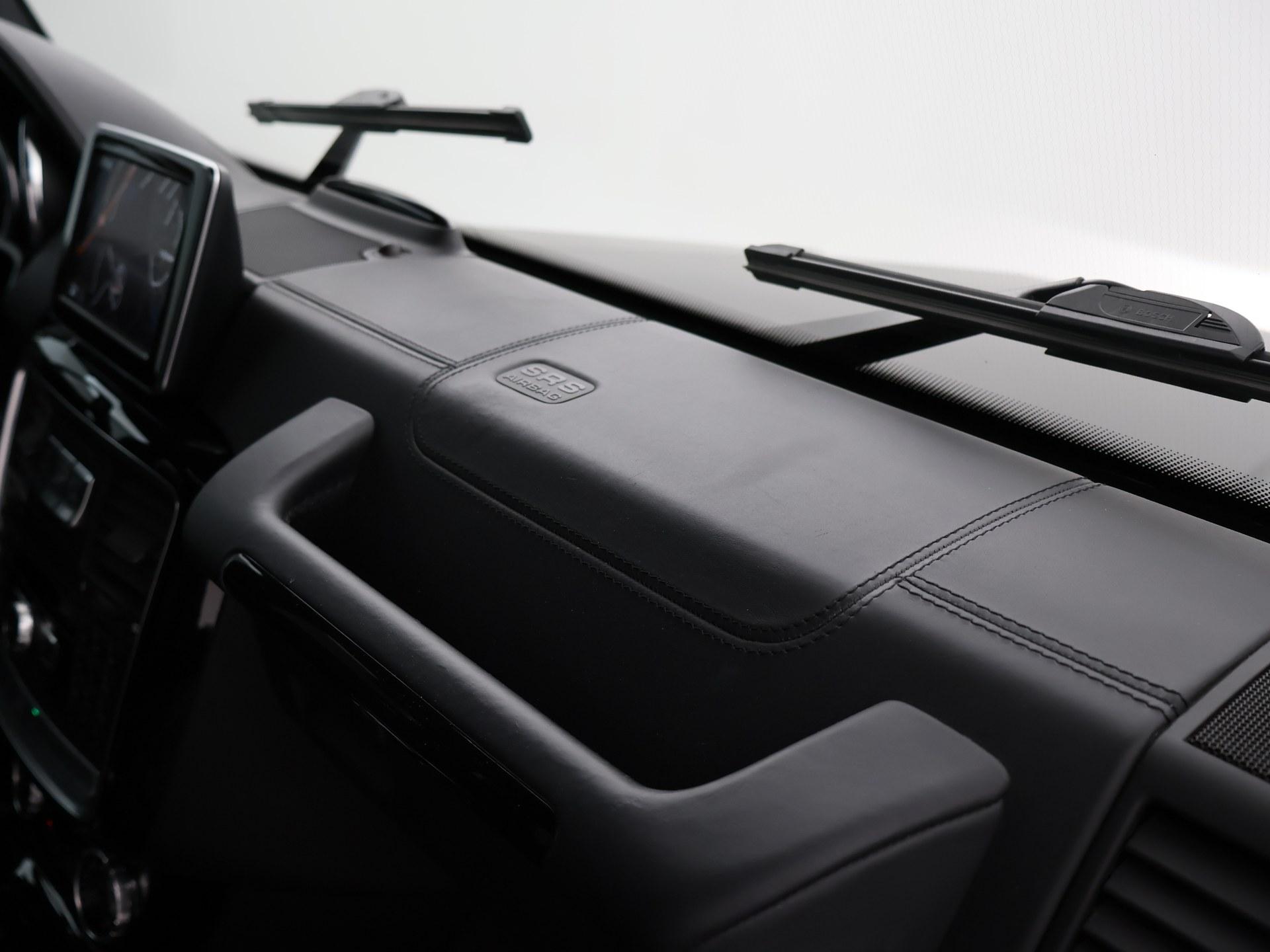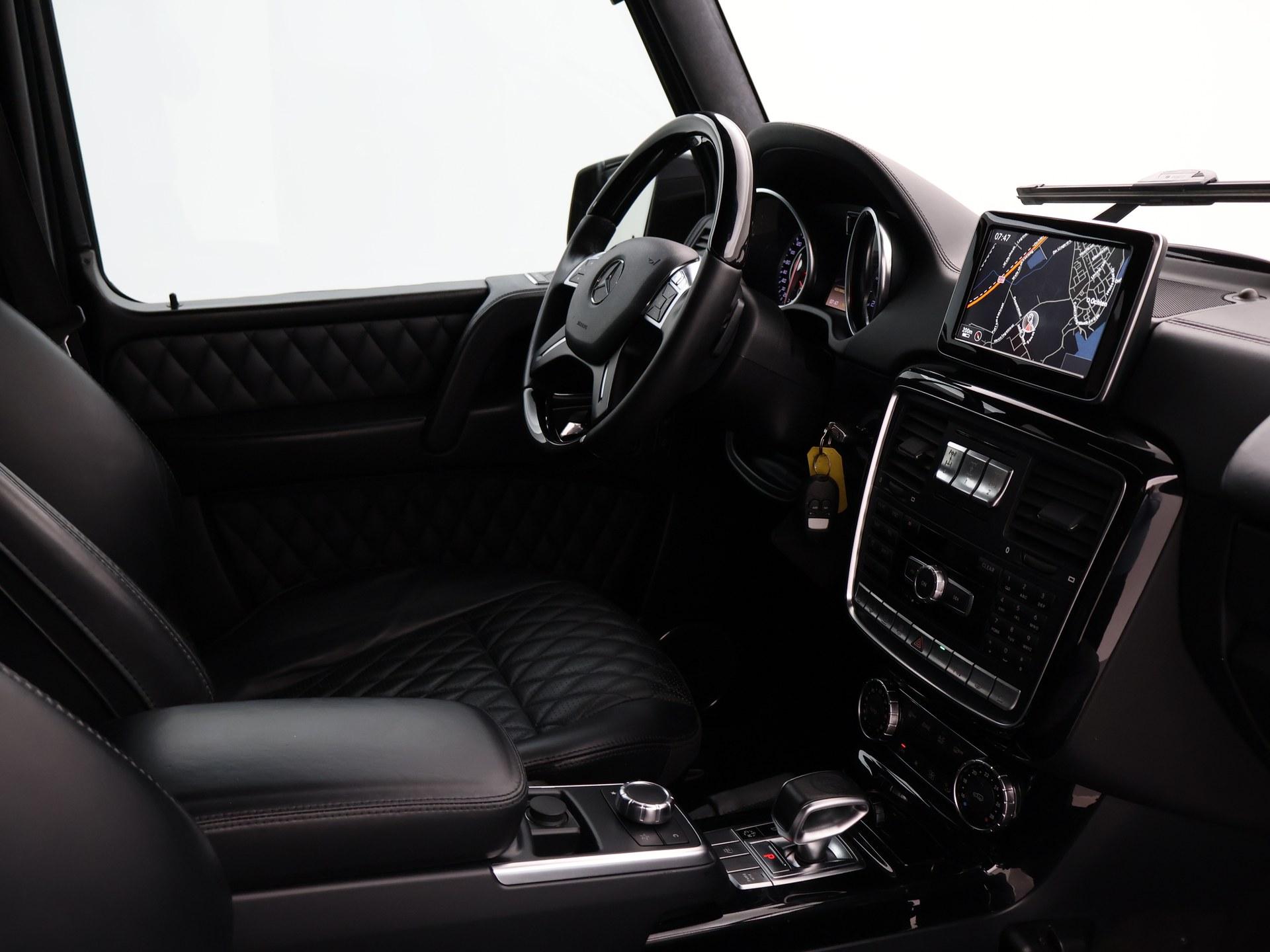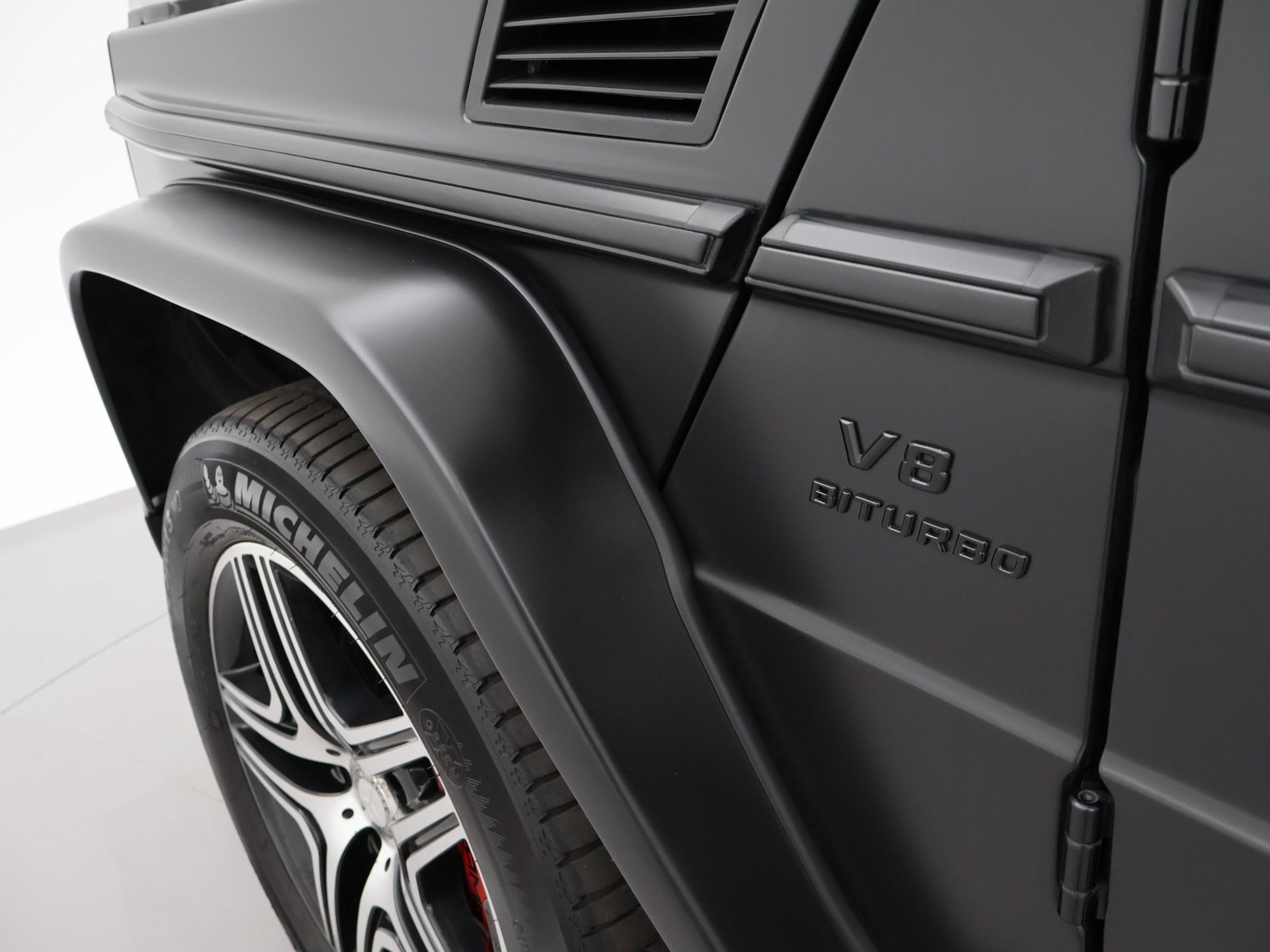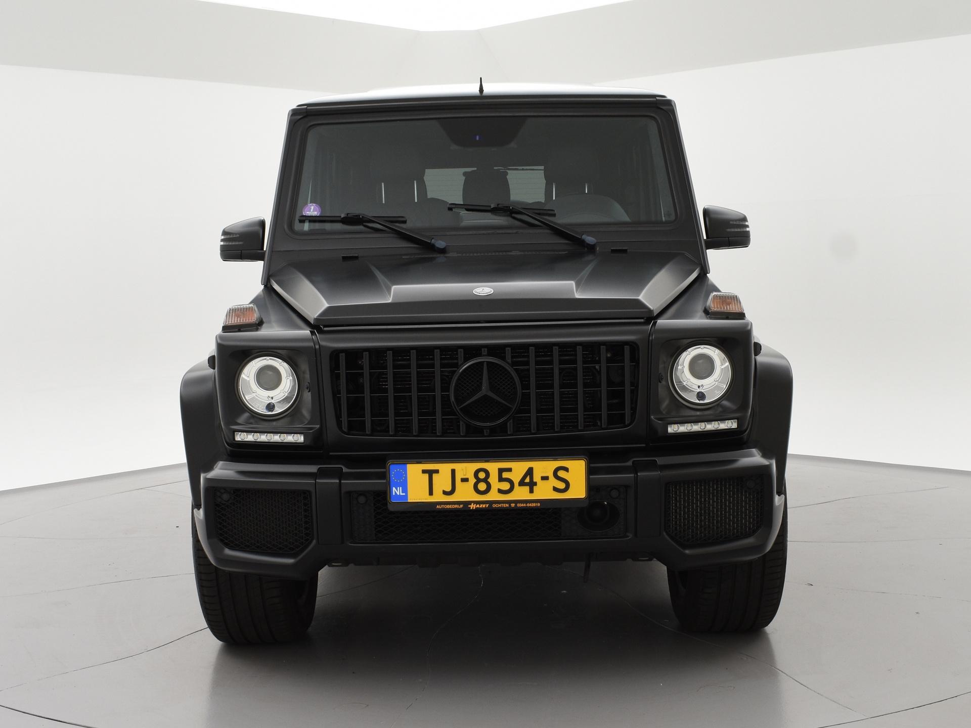 G63 AMG 5.5 V8 Bi-Turbo 544 PK 4X4 met 7-traps automaat, Nieuw geleverd in Duitsland, dus originele EU uitvoering, Nederlands kenteken is uit 2018. Registratie/bouwjaar 11-2013 maar modeljaar 2014 in de wagenkaart, RDW nieuwprijs 234.497 euro. In 2024 compleet gewrapt in het mat zwart: Satin Black, zoals de originele fabriekskleur op het nieuwste type. Tevens zijn in 2024 de beide uitlaatdempers vervangen (origineel van Mercedes-Benz). In 11-2024 nog onderhoud gehad. Diverse onderhoudsfacturen aanwezig. De fabriekskleur onder de wrap is glanzend zwart: Obsidian black metallic exterieurkleur met Designo zwart leder exclusief interieur met ruitjes stiksels in de stoelen en deurpanelen, Designo exclusief pakket met zwarte alcantara hemelbekleding, Designo trim Piano Lacquer black dashboard inleg, Designo hout/leder stuurwiel met zwart pianolak hout, Zwarte exterieurstyling: zwarte logo's, type aanduidingen, stootlijsten, raamlijsten, treeplanken etc. Rear Entertainment origineel DVD Multimedia entertainment pakket vanaf fabriek (optiecode EM7) met Mercedes-Benz schermen met DVD speler en draadloze headsets, 20 inch AMG velgen met rode AMG remklauwen, Standkachel origineel vanaf fabriek met afstandsbediening, 4 AMG uitlaten voor de achteras onder de treeplanken, Distronic+ Adaptive cruise control, Comand Online Navigatiesysteem, Dodehoek detectie, Harman/Kardon premium sound met Logic7 geluid, Multicontourstoelen met breedteregeling en lendesteun, Stoelventilatie, Stoelverwarming voor + achterin, Elektrisch schuif/kanteldak, DVD/CD-wisselaar voorin, Bluetooth telefoon + audiostreaming voor o.a. Spotify, Achteruitrijcamera, Privacy glass, HomeLink universele garagedeur afstandsbediening in de binnenspiegel, Elektrische stoelverstelling en stuurwielverstelling met geheugen, Elektrisch inklapbare buitenspiegels, Bi-Xenon koplampen, LED dagrijverlichting, Elektrisch verwarmbare voorruit, Climate control met links/rechts gescheiden temperatuur, Bagagenet verticaal + rolhoes horizontaal, Trekhaak met 3.500 kg trekgewicht op kenteken, Verlichte AMG dorpellijsten, Parktronic parkeersensoren voor + achter, AMG Speedshift Plus 7G-tronic automaat, 4X4 met sper voor-midden-achter, M157 motor, Reservewiel met hardcover, Isofix in de achterbank, Nieuw type grille.
