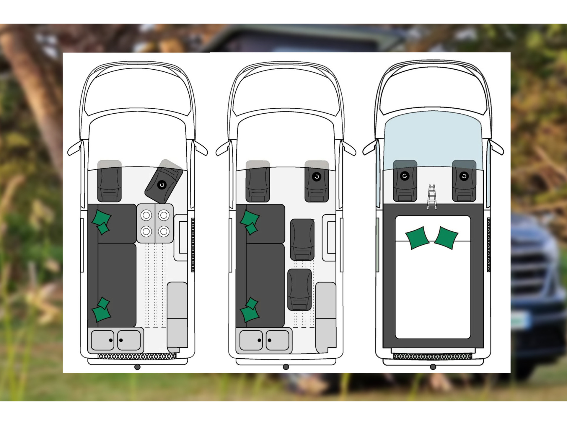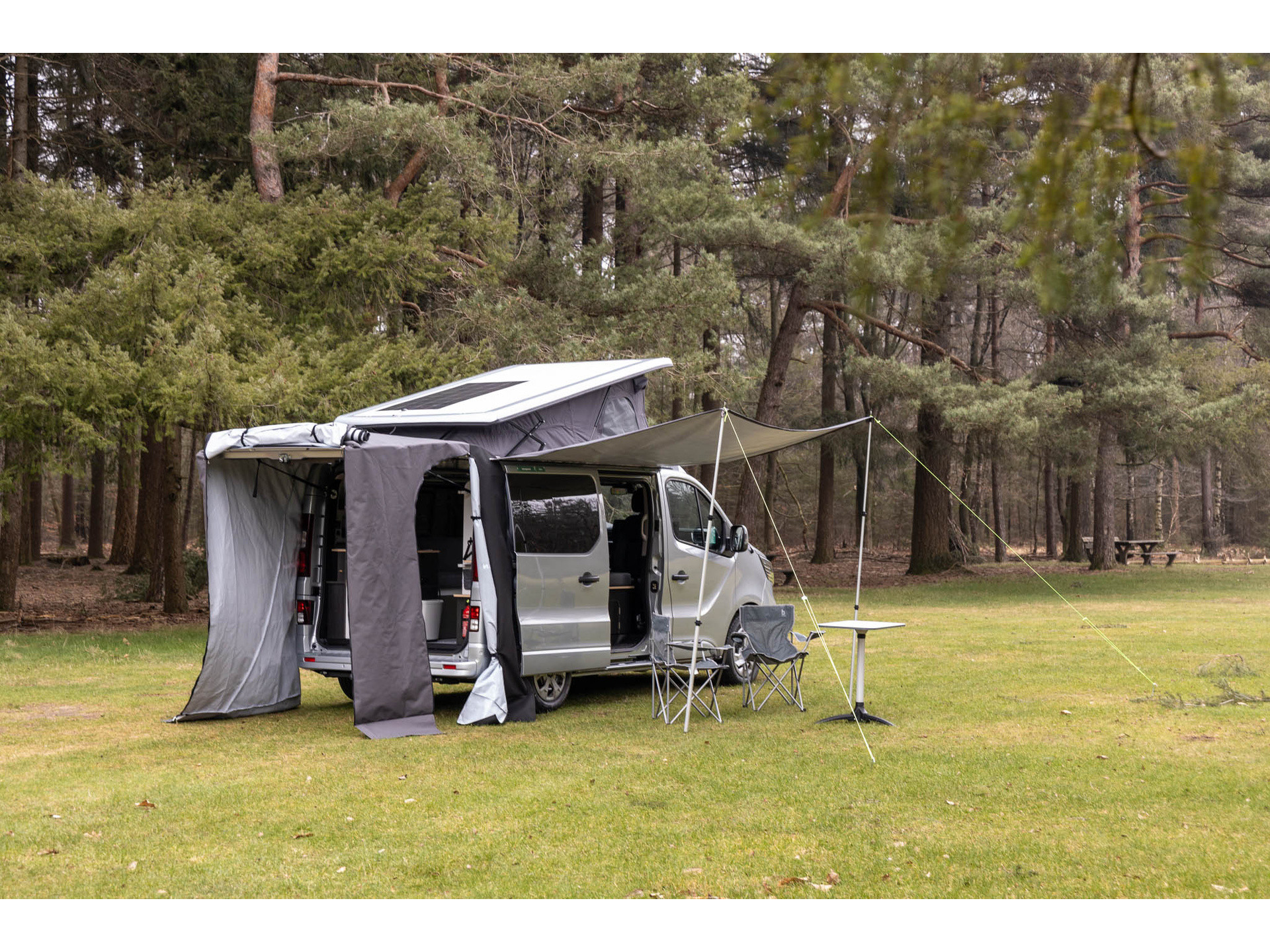 Slaapplekken boven: 190 × 130 cm, Slaapplekken beneden: 2 personen: 195 × 130 cm: enkel uitklapbaar als er achteraan het voertuig geen stoelen aanwezig zijn, Horren: zijdeur en achterklep, Gordijnen in gevoerde stof, Raamisolatie voorruit en zijruiten,
