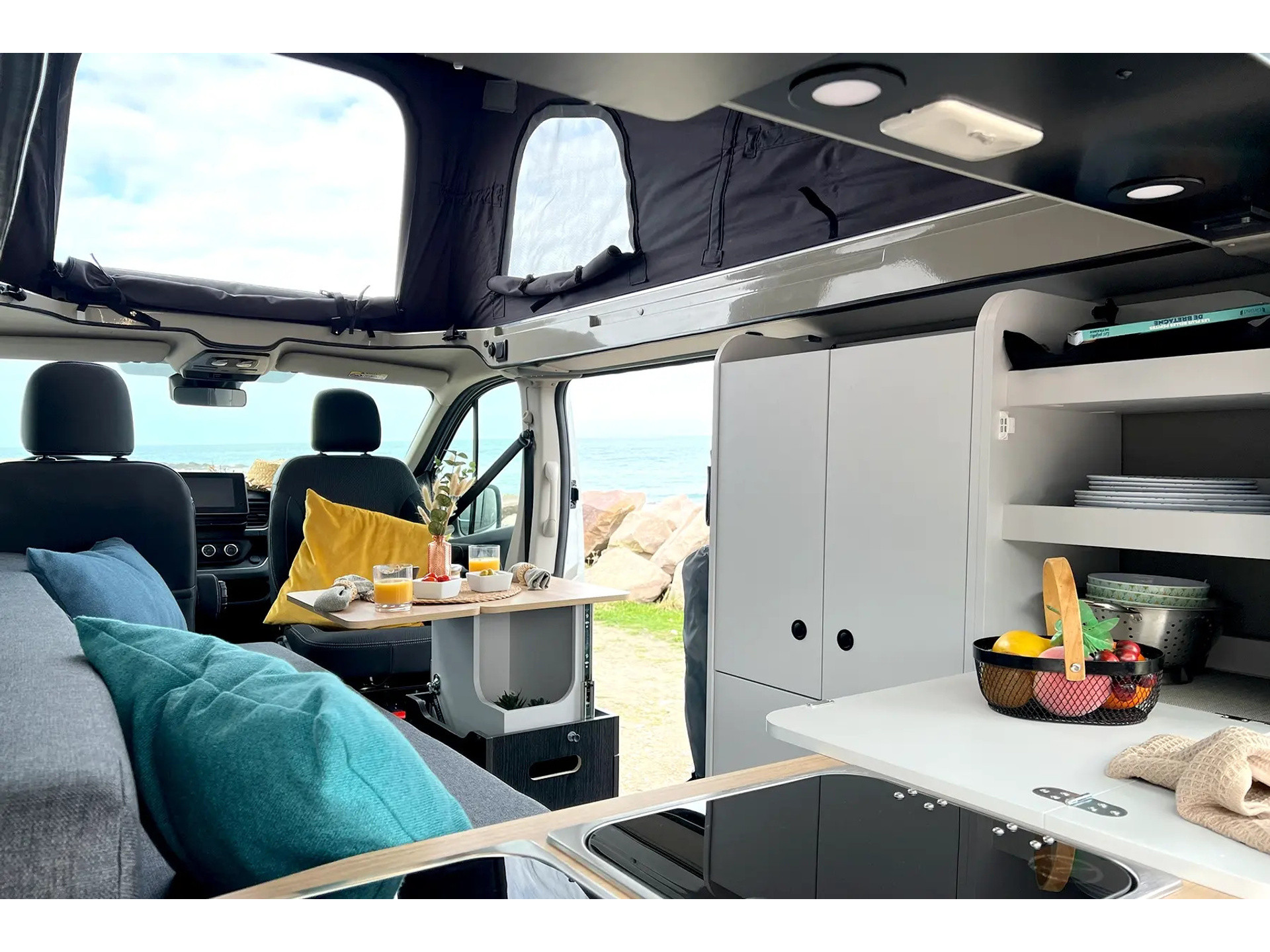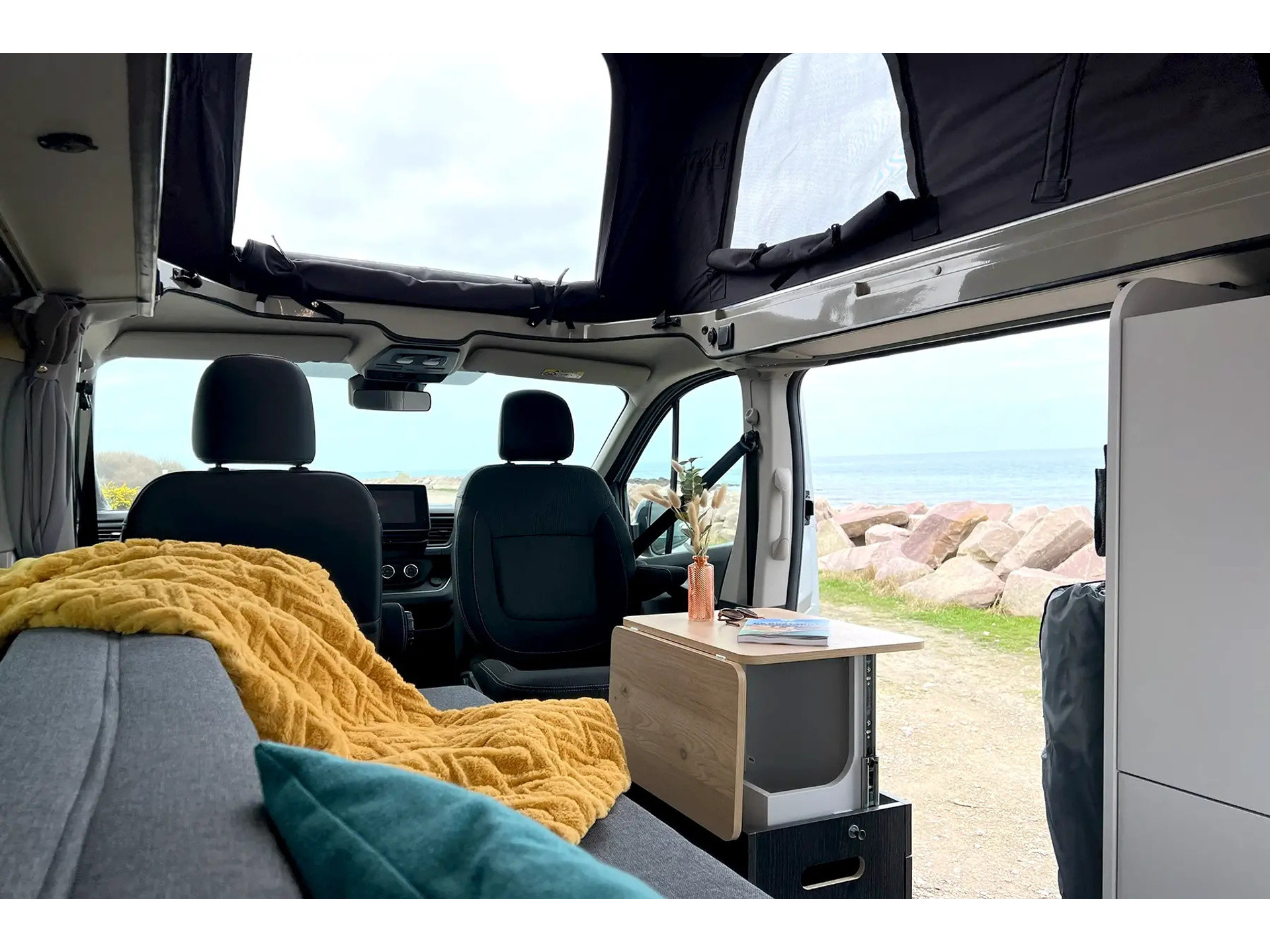 Leefruimte met 4 zitplaatsen, Hefdak, Draaibare passagiersstoel, Multifunctionele tafel van 50 × 69 cm uitgeklapt (uitschuifbaar op rails), voor 2 couverts, met geïntegreerde opbergruimte, Grote bagageruimte onder de zitbank (145 l)